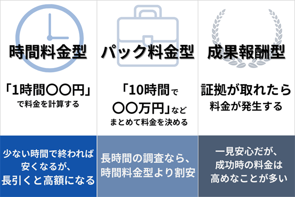 まず各社を比較する前に、探偵事務所の料金体系には3種類あると覚えておいてください!
