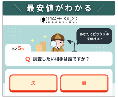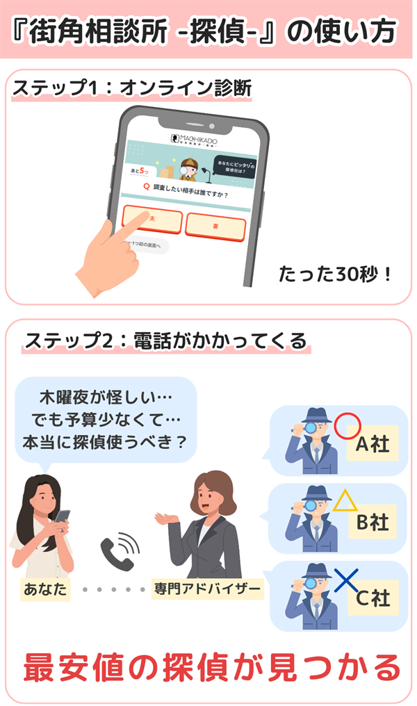 そこでおすすめなのが、探偵事務所の見積もりサービス『街角相談所 -探偵-』です。